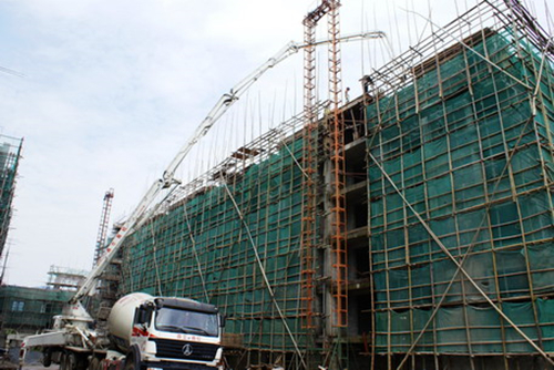 5、浇捣梁板混凝土时,在梁与板交界处,宜先浇捣梁部位混凝土,振捣密实后再浇捣板面混凝土,这样可避免或减少发生在梁板交界处的沉降收缩裂缝。浇筑带斜坡的基础时,第一次浇至斜坡下平,浇筑一段后再返回来浇筑斜坡部分。浇筑大体积混凝土、地下室墙和剪力墙时,要分层连续浇筑,分层厚度为300~500mm。当水平结构的混凝土厚度大于500mm时,应按1:6~1:10的坡度分层浇筑,且上层混凝土应超前覆盖下层混凝土500mm以上,浇筑上层混凝土时下层混凝土不得超过初凝时间。