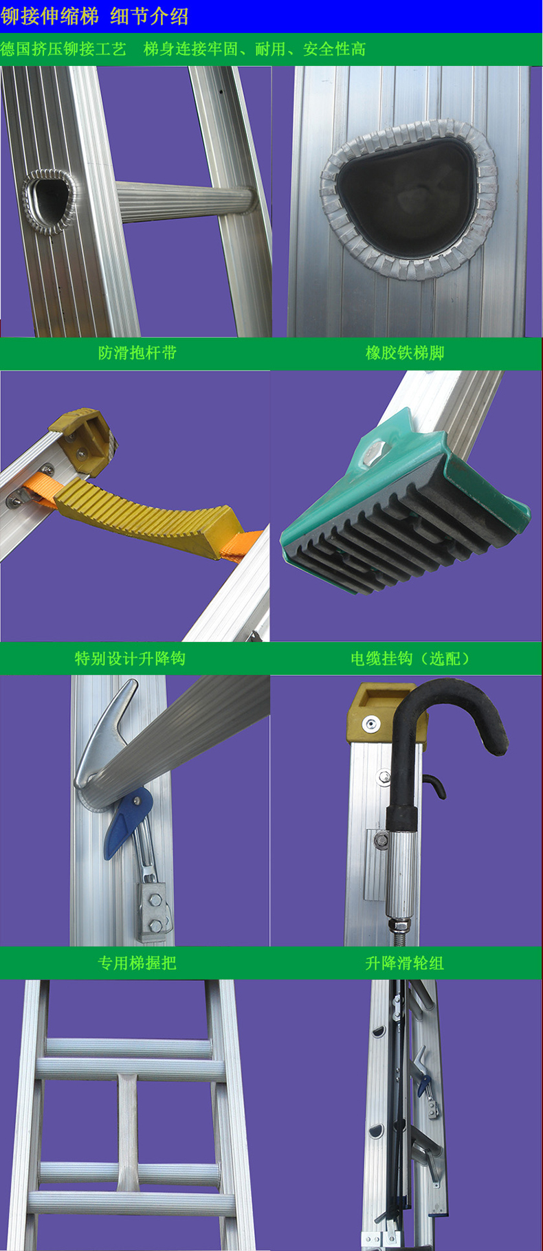 2.由上下节梯组合,借助升降钩、滑轮组及拉绳使上下节梯升降到所需高度。